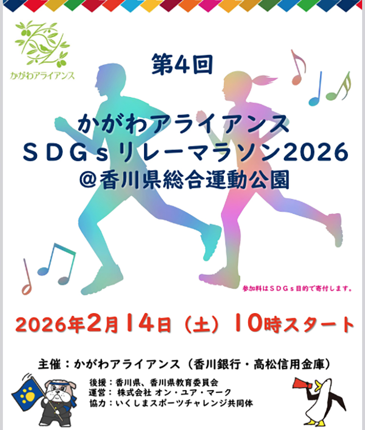 地域金融機関である香川銀行(有木 浩頭取)と高松信用金庫(大橋和夫理事長)が連携して活動する「かがわアライアンス」は、地域住民の健康づくりとSDGsの理解促進を目的に、「かがわアライアンスSDGsリレーマラソン2026」 […]