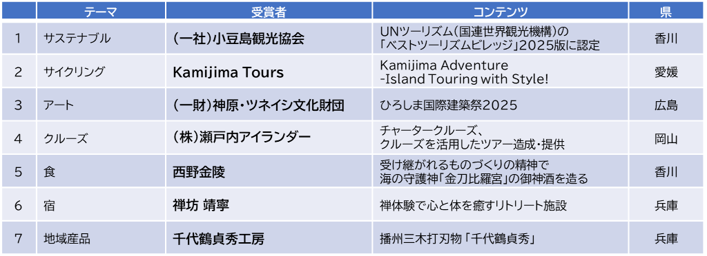 せとうちDMO(※)では、せとうちDMOが注力する7つのテーマごとに、今年度最も魅力的だった観光コンテンツを表彰する「せとうちDMOアワード」を開催しており、今年度2025年度の受賞者が決定いたしました。 せとうちDMO […]