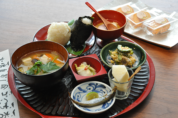 ウェルカムスイーツとして、前山産のゆずを使った柚子クッキーを提供。夕食付きプランには、オリーブ豚のバーベキューセット、しゃぶしゃぶなど、朝食には前山地区のお米と食材を使う、おにぎり定食が用意される。