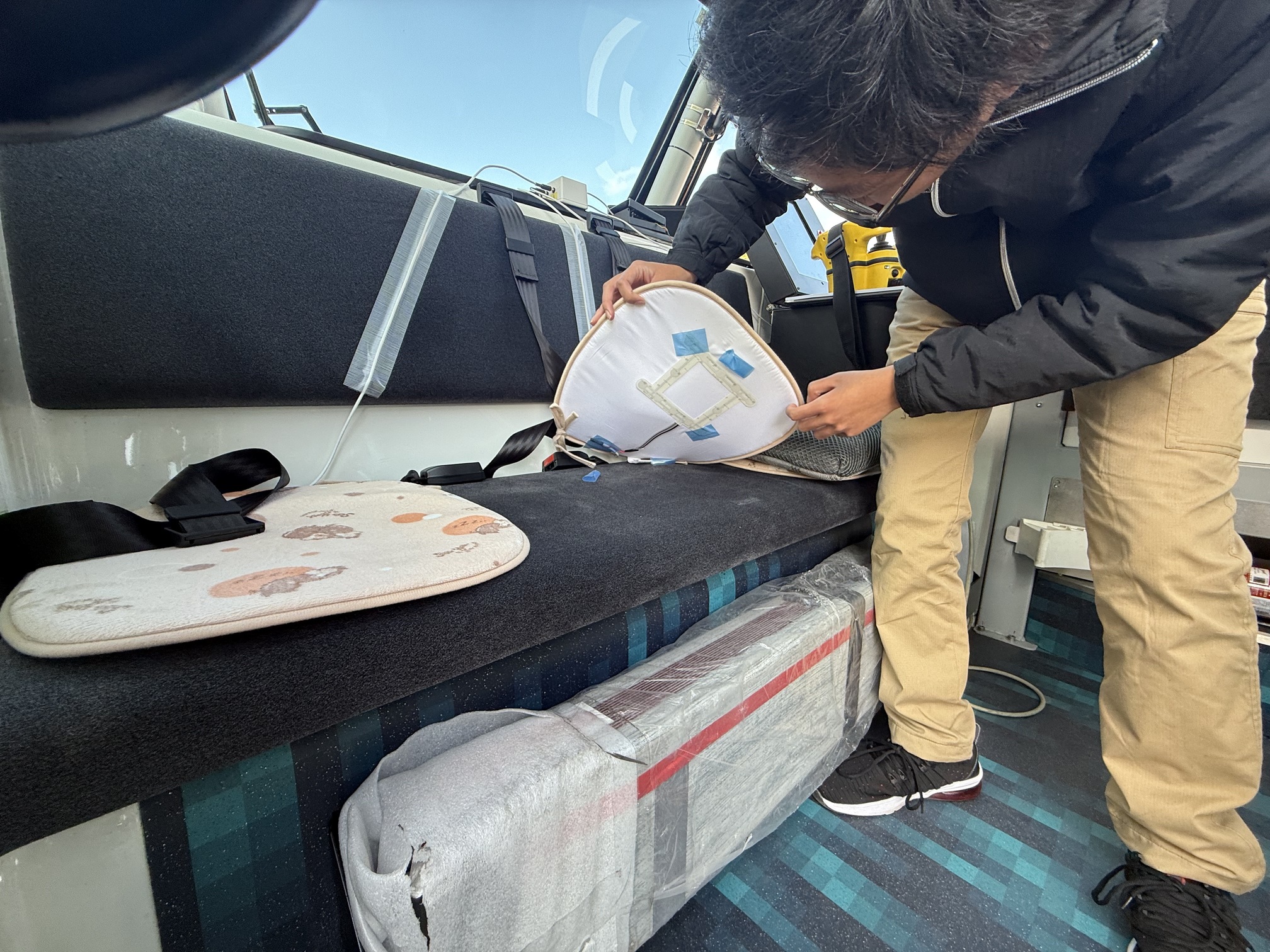 データ取得のため、実際に学生らはバスに乗り込み、着座センサーを内蔵した薄型クッションに、特定の一ヶ所には呼吸、心拍、体動が分かる機器と着座センサーを併用した厚型クッションを設置、確認作業をおこなった。乗車した人の体の動き、呼吸によって発生する微弱な電気信号を測定し、データを収集し、AIを用いて乗客の状態計測システムを構築していく方針。