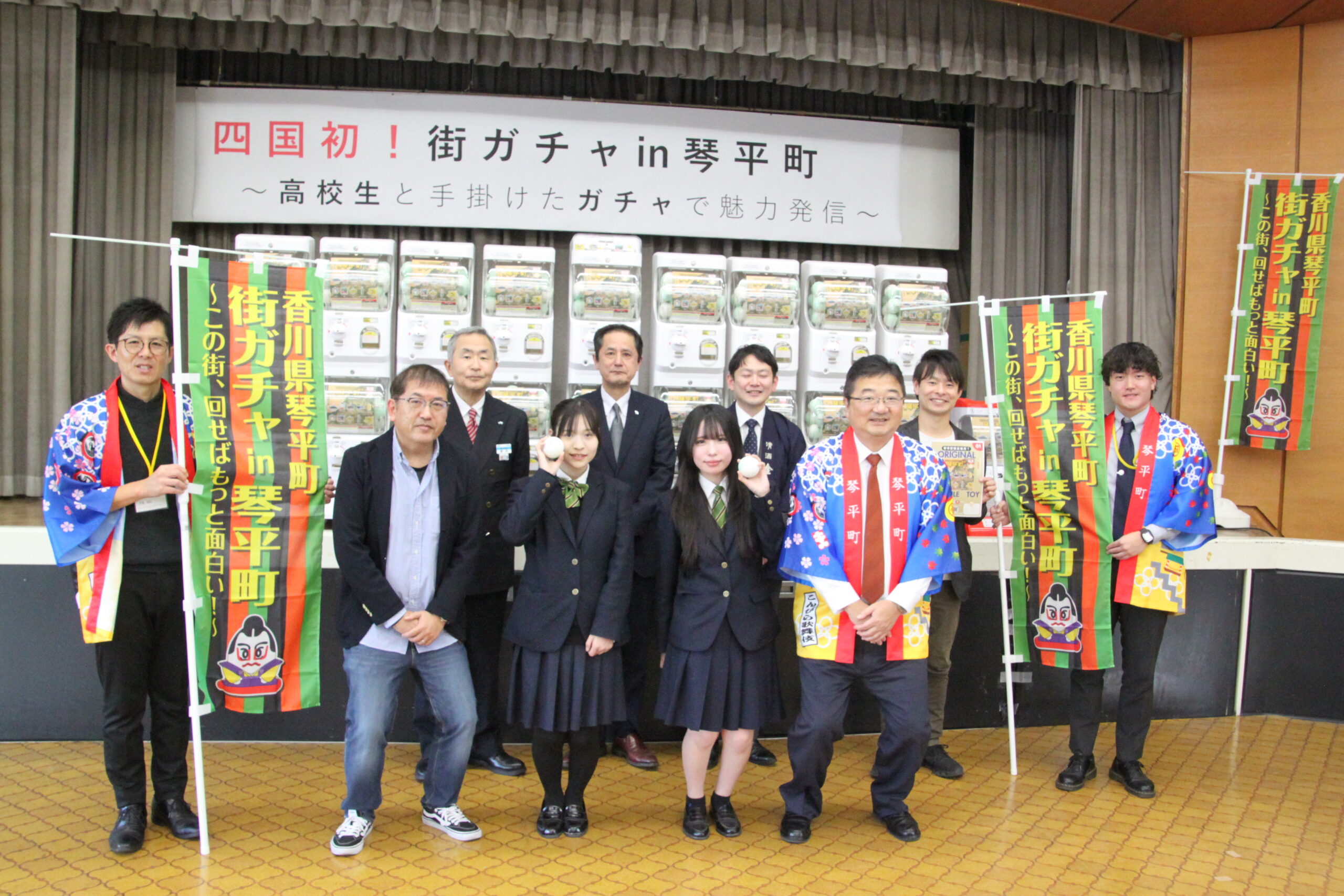 琴平町が四国初となる町全体をモチーフとしたカプセルトイ「街ガチャ」の導入に先駆け、記念セレモニーを琴平町総合センター2階大ホールで開催した。