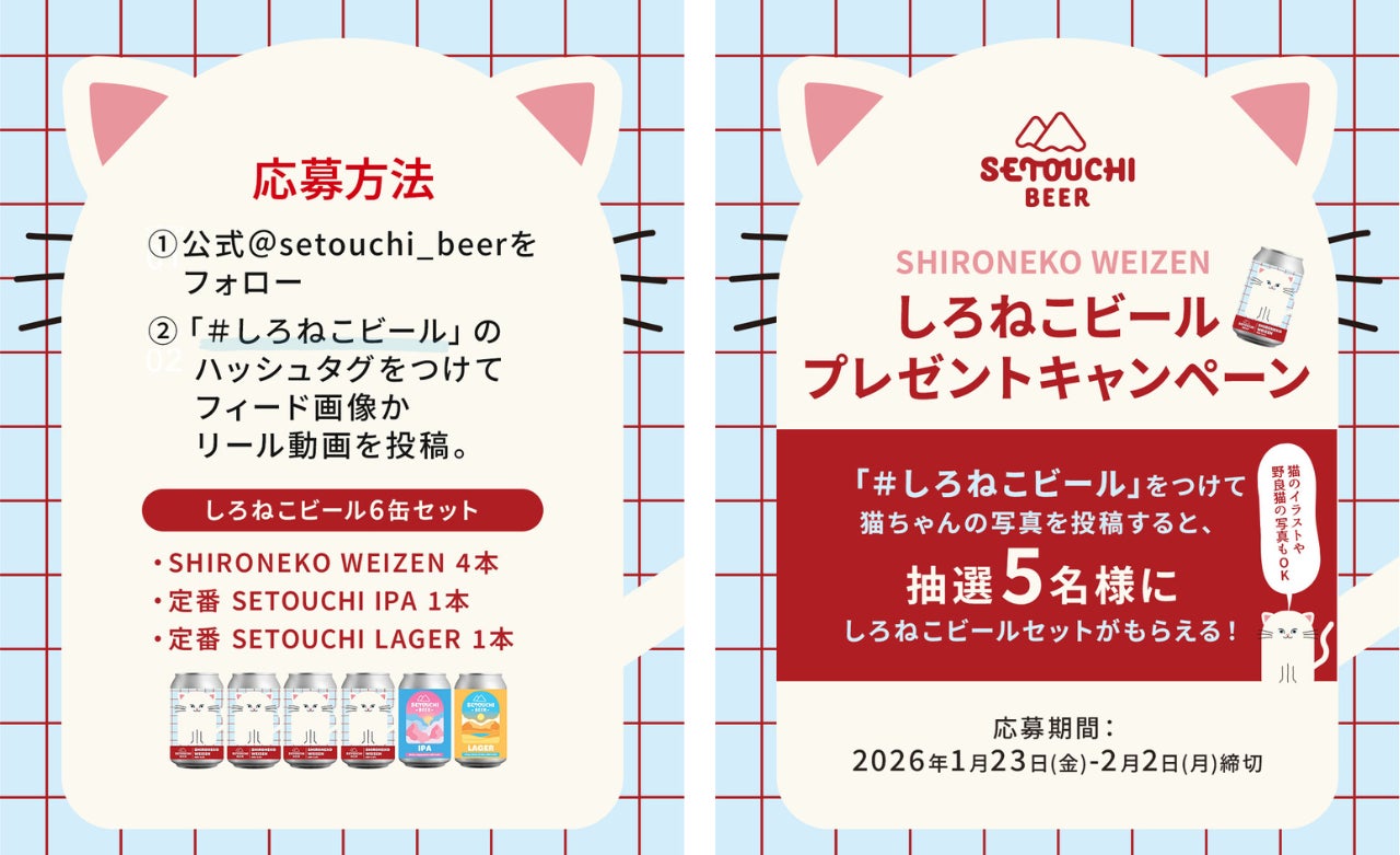 Instagramでは「#しろねこビール」のハッシュタグとともにご自宅の猫ちゃんや野良猫の写真を投稿をしてもらえると、SETOUCHI SHIRONEKO WEIZENがもらえるキャンペーンを実施する。みなさまのご参加待っています。