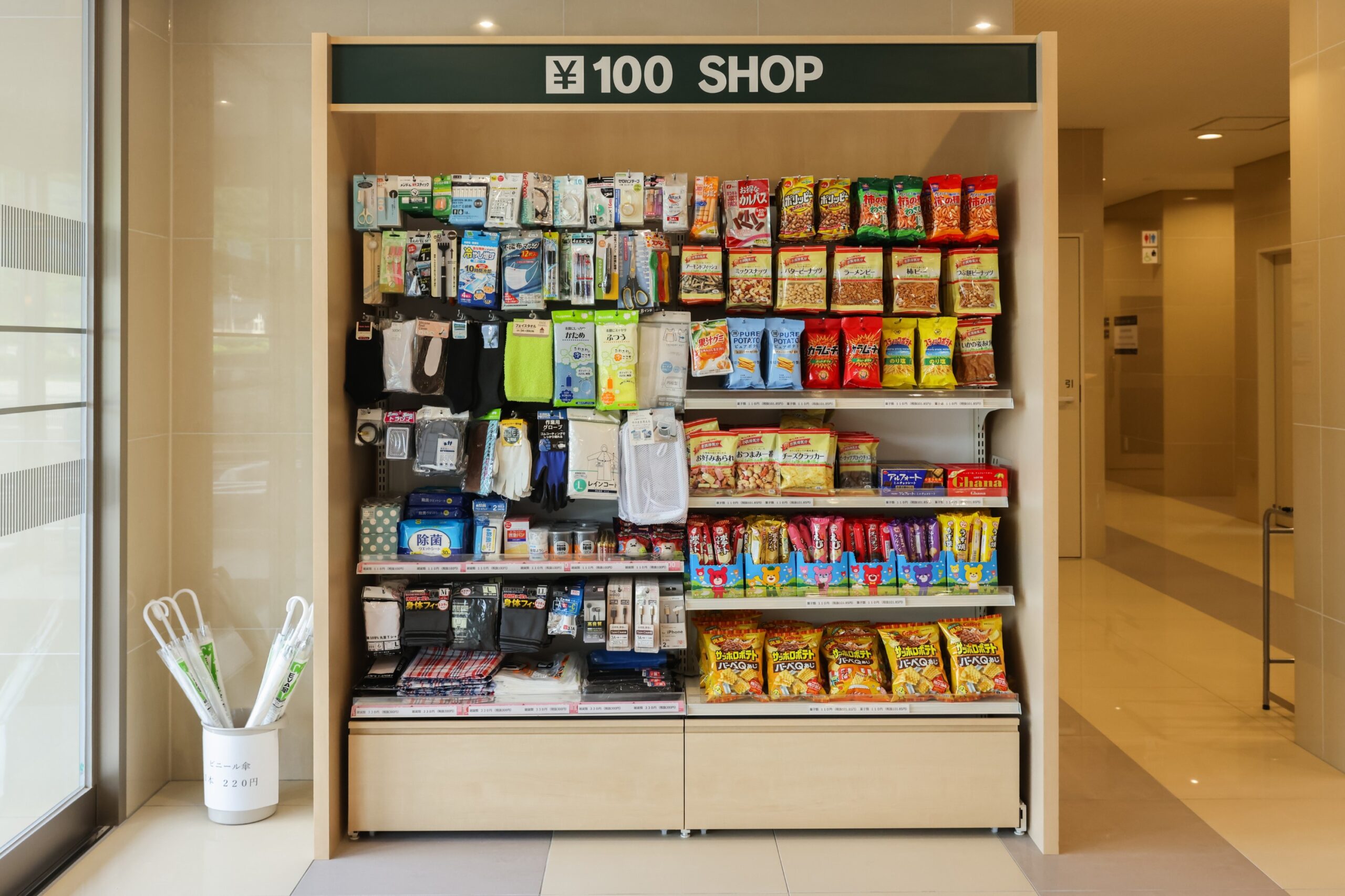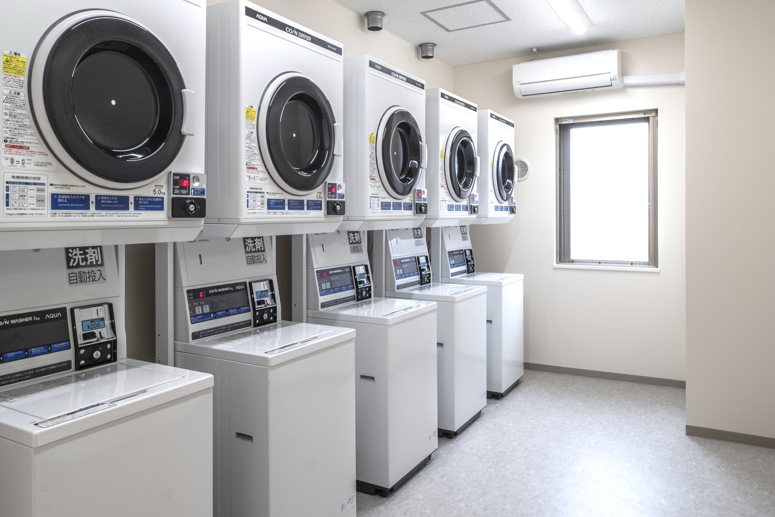 「あると助かる」が揃う館内設備 無料の平面駐車場(220台)を完備。さらに、館内には100円ショップやコインランドリー(洗剤自動投入)も併設されており、急な泊まりや長期滞在にも柔軟に対応する。