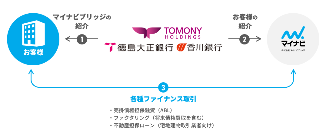 SME(中小企業)向けファイナンスを展開する株式会社マイナビブリッジ(代表取締役:庄司靖)は、トモニホールディングス傘下の徳島大正銀行および香川銀行と「トモニ販路拡大サポート基本契約」を締結し、地域企業の資金繰り強化に向けた連携を開始しました。
