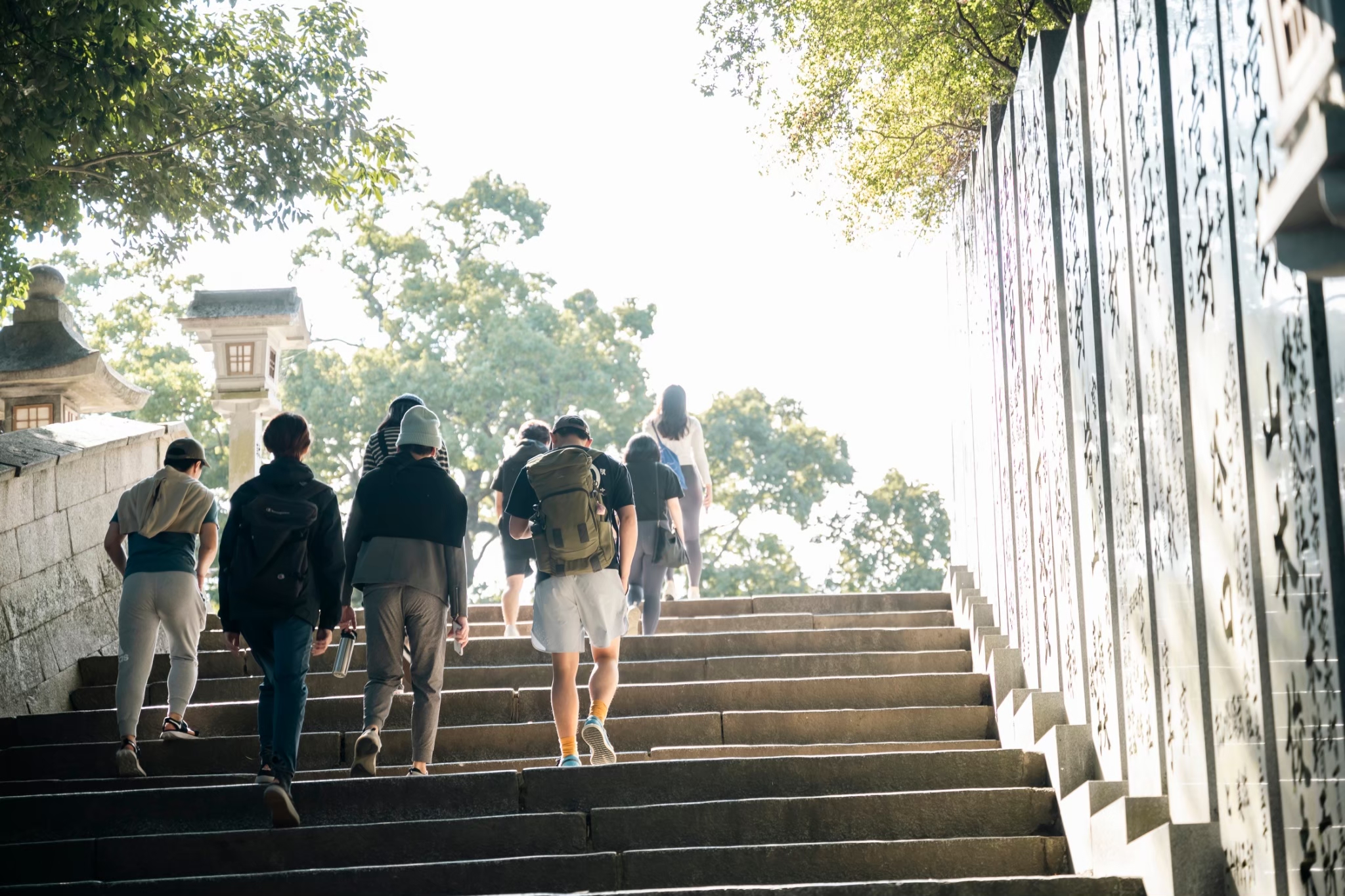 「暮らし」を想像するコンテンツ うどん打ち体験や廃ビル再生プロジェクト(HAKOBUNEビル)の見学を通じ、町の文脈を理解。翌朝の「早朝参拝」では、観光地としての表層ではない、歴史の深さを体感します。