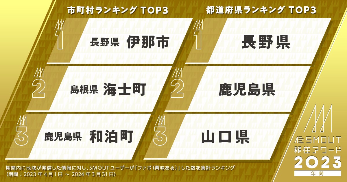 移住・関係人口を促進するプラットフォームサービス「SMOUT」を運営する株式会社カヤック(神奈川県鎌倉市、代表取締役CEO:柳澤大輔)は、移住希望者から興味・関心を集めている人気移住地域をランキング化した「SMOUT移住アワード2023」を4月24日(水)に発表した。